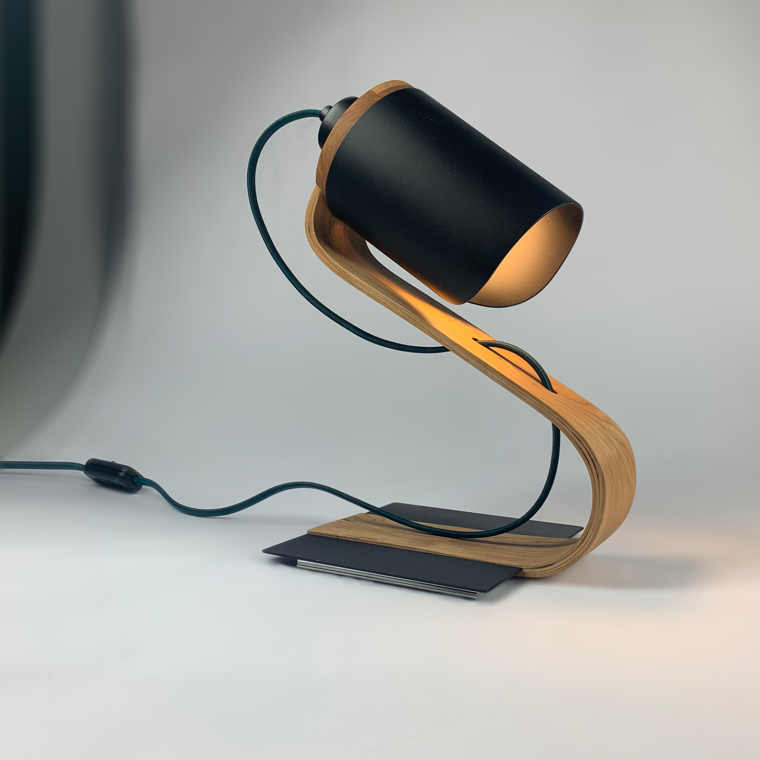This design was meant to bring character and evoke joy in what are traditionally mundane and utilitarian objects. The design plays with light and shadow on the wood bent lamination frame. Instead of hiding the cable routing, holes on the wooden frame allow the cord to accentuate the lamps figure. Magnetic attachment of the light shade allows for easy customization and replacement of the bulb.