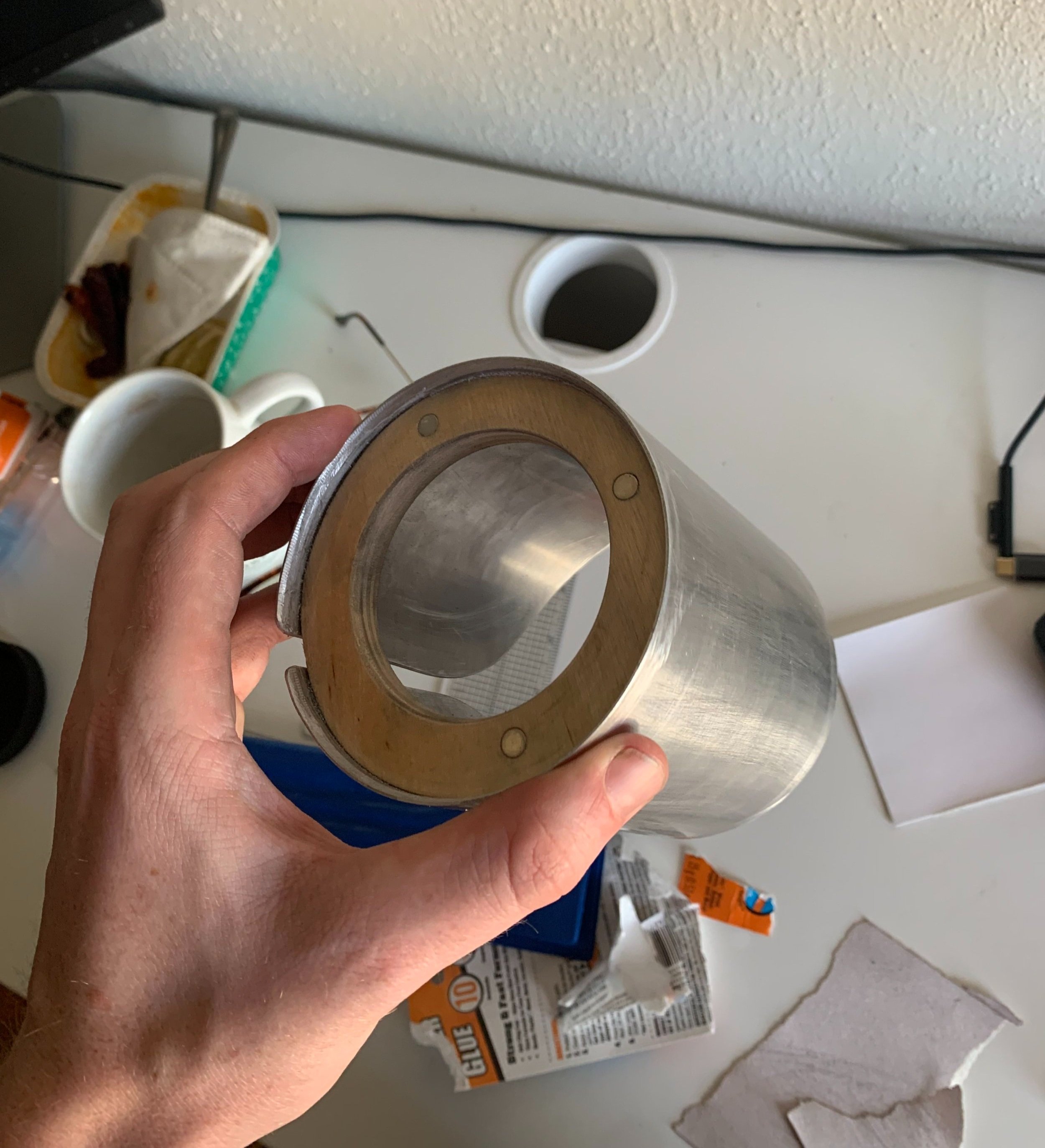 The main shade is built around a wooden ring with magnets that connect to the wooded base. Sheet Aluminum was rolled to match the correct diameter before the whole piece was sprayed a matte black.