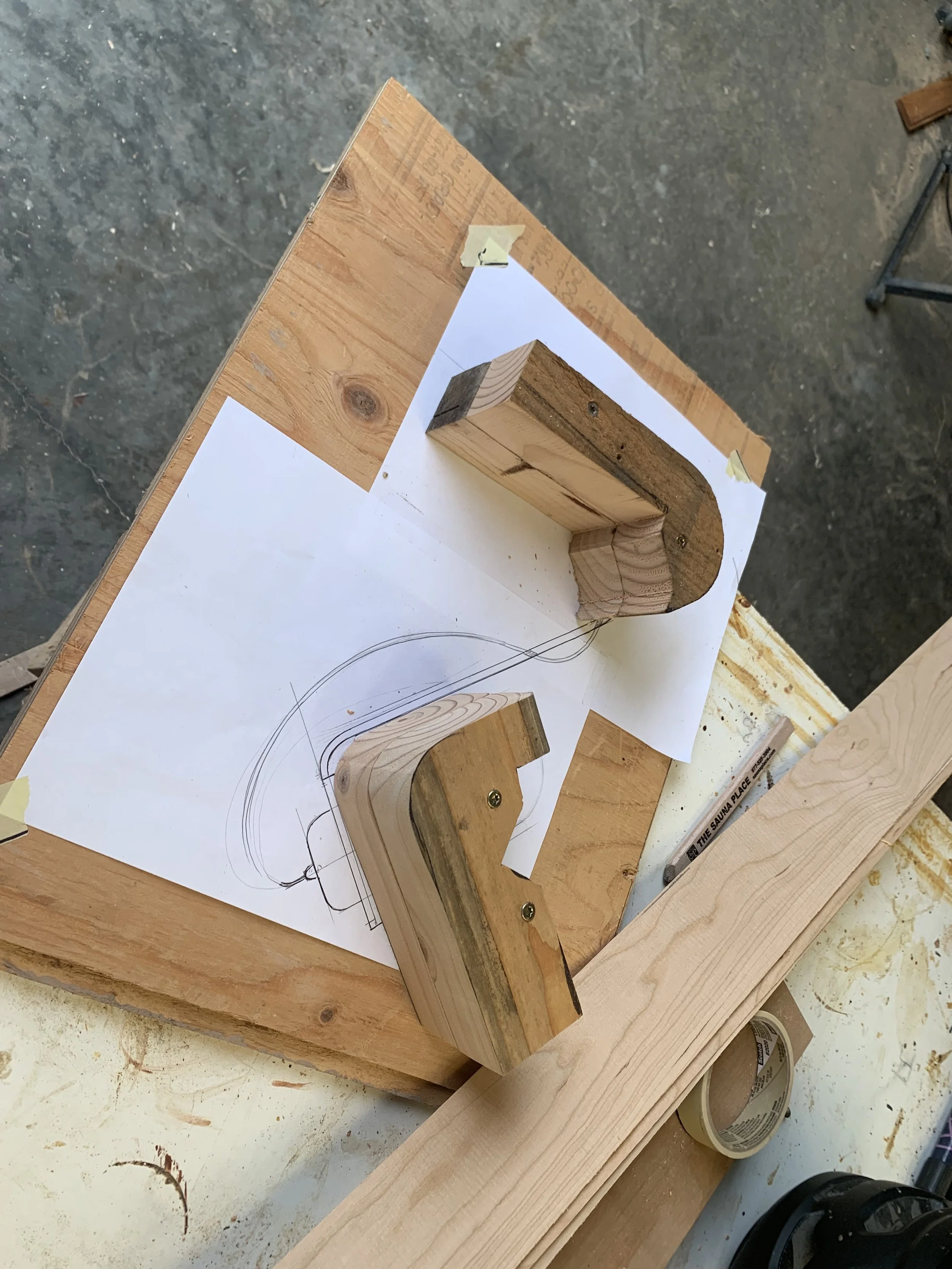 The refined clamping jig is designed for clamping at critical areas during the final glue-up. Key areas such as the two main bends have corresponding supports that hold the wood in the correct position.